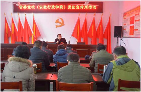 開展一次送憲法下鄉(xiāng)。12月6日,校領(lǐng)導丁毅帶領(lǐng)幫扶干部和法學教研部骨干教師赴我校定點幫扶村六安市裕安區(qū)青山鄉(xiāng)八字崗村,開展“送憲法下鄉(xiāng),助力精準扶貧”活動,請法學教研部杜敏教授為村黨員干部和村民做一次《憲法修改的中國實踐》專題講座。幫扶干部深入貧困戶走訪慰問,贈送憲法讀本,宣傳憲法,營造遵紀守法、誠實守信的良好村風民風。