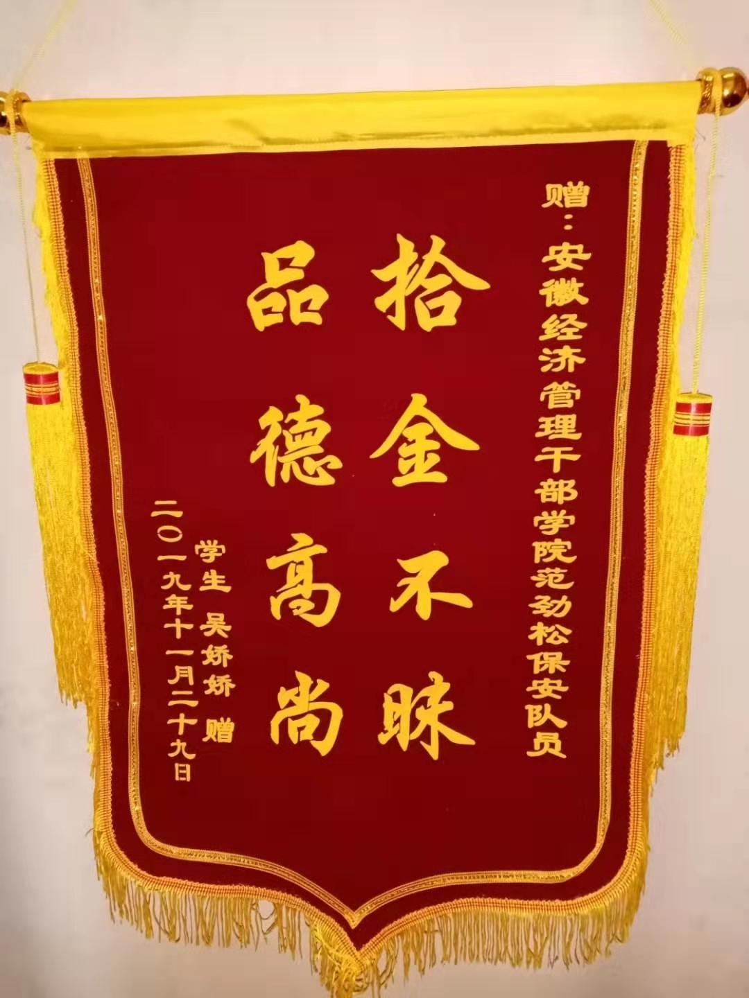 11月29日上午十點(diǎn)左右,省委黨校(安徽行政學(xué)院)西校區(qū)保安人員范勁松在北大門執(zhí)勤過程中,撿到智能手機(jī)一部(價(jià)值三千余元)。范勁松立即和保安隊(duì)長(zhǎng)說明情況,并將手機(jī)上交登記。很快失主(安徽經(jīng)濟(jì)管理學(xué)院社工系文秘六班學(xué)生)打來了電話,經(jīng)保安隊(duì)核實(shí)無誤后,通知失主前來認(rèn)領(lǐng)并現(xiàn)場(chǎng)歸還。12月2日晚,失主特意定制一面錦旗送給范勁松,贊揚(yáng)其高尚的品德和拾金不昧的精神。