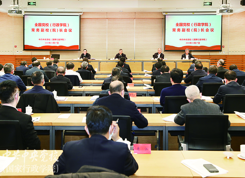 全國黨校(行政學院)常務副校(院)長會議2020年12月27日在中央黨校(國家行政學院)召開。會議主題是,深入貫徹習近平總書記關于黨校辦學治校系列重要指示精神,貫徹黨的十九大和十九屆二中、三中、四中、五中全會精神,進一步推動《中國共產黨黨校(行政學院)工作條例》(以下簡稱《條例》)和全國黨校(行政學院)校(院)長會議精神落實,研究“十四五”時期黨校(行政學院)事業發展。中央黨校(國家行政學院)分管日常工作的副校(院)長李書磊出席會議并講話,副校(院)長甄占民作會議討論小結,副校(院)長李季主持會議,副校(院)長李毅、謝春濤出席會議。