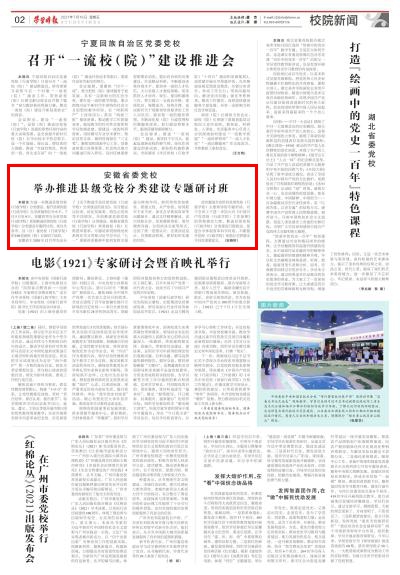 安徽省于2020年12月率先出臺了《關于推進全省縣級黨校(行政學校)分類建設的意見》,區分建設達標類、優化發展類、特色示范類等不同情況,全面推進縣級黨校(行政學校)分類建設。根據省委黨校(行政學院)常務副校(院)長陳愛軍要求,專題培訓班圍繞黨校系統在學習貫徹習近平總書記“七一”重要講話精神中如何發揮主渠道主陣地作用,如何堅持黨校姓黨、質量立校、從嚴治校,如何抓牢主業主責、深化辦學體制改革等問題展開,通過文件精神解讀、試點經驗分享、實地調研查看、填寫調查問卷、分組座談交流等形式,達到了統一思想認識、注重頂層設計、完善聯動機制、抓好組織實施的目的。