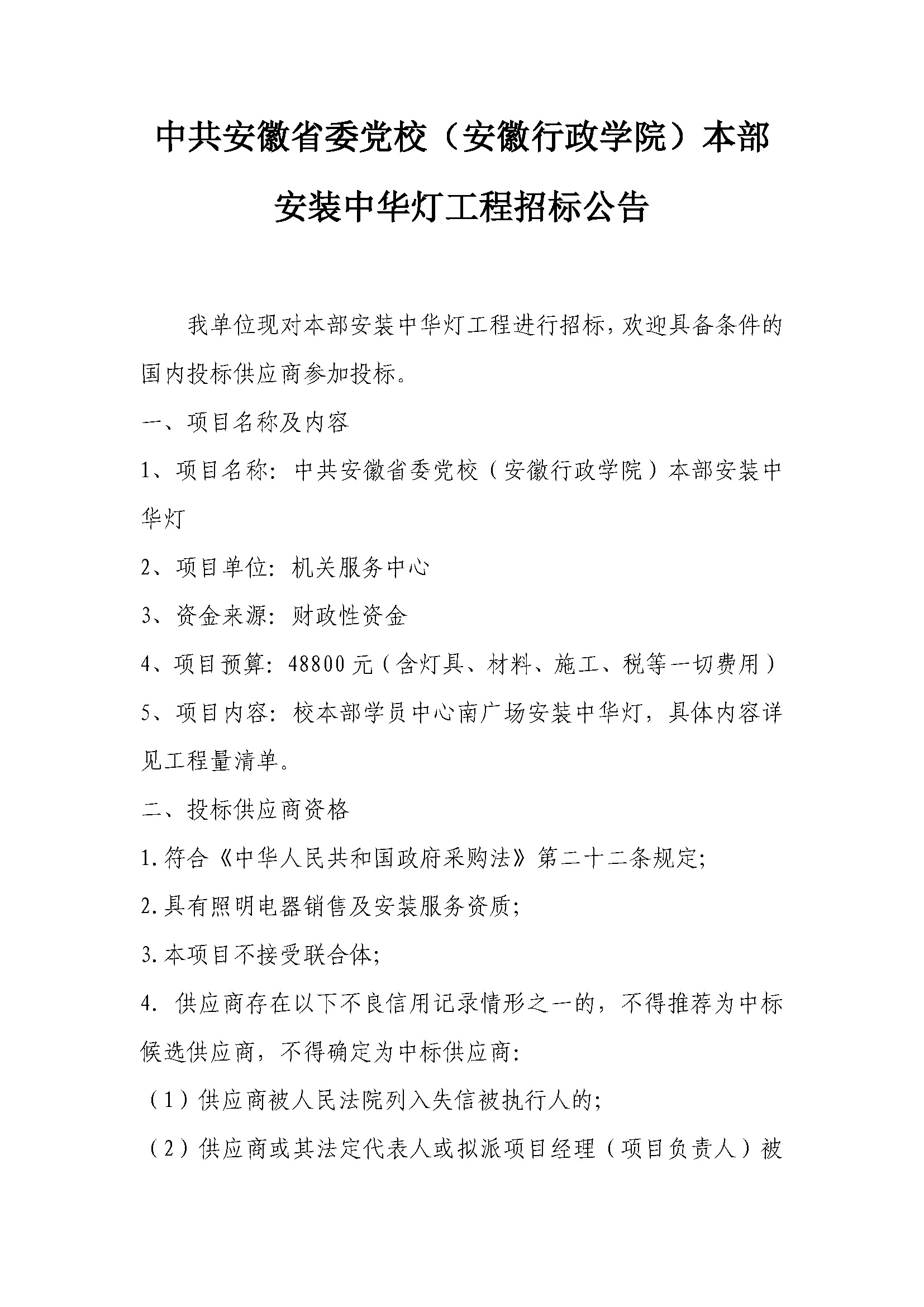 中共安徽省委黨校(安徽行政學院)本部安裝中華燈工程招標公告