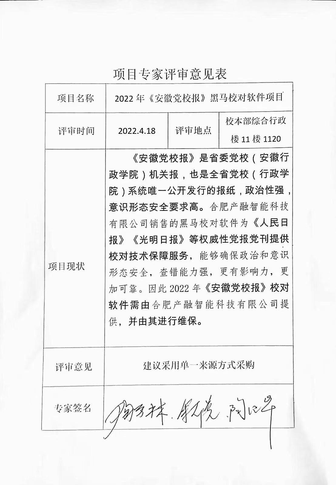 《安徽黨校報》是省委黨校(安徽行政學院)機關報,也是全省黨校(行政學院)系統(tǒng)唯一公開發(fā)行的報紙,政治性強,意識形態(tài)安全要求高。合肥產融智能科技有限公司銷售的黑馬校對軟件為《人民日報》《光明日報》等權威性黨報黨刊提供校對技術保障服務,能夠確保政治和意識形態(tài)安全,查錯能力強,更有影響力,更加可靠。因此2022年《安徽黨校報》校對軟件需由合肥產融智能科技有限公司提供,并由其進行維保。