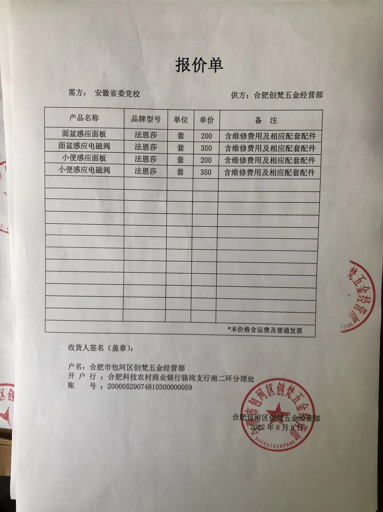 中共安徽省委黨校(安徽行政學)潔具維修采購項目于2022年6月14日下午17:00開標。中標供應商為合肥市包河區創梵五金經營部,現予以公告,公告期為2022年6月15日至2022年6月17日。