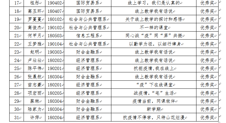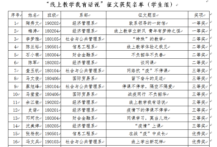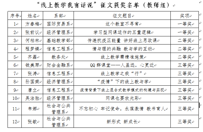 經專家評審,國際貿易系方春梅老師的《這個教室不尋常》等12篇教師征文分獲一、二、三等獎;經濟管理系陶秀文同學的《致系領導的一封信》等31篇學生征文分獲一、二、三等獎和優秀獎。獲獎名單公布如下: