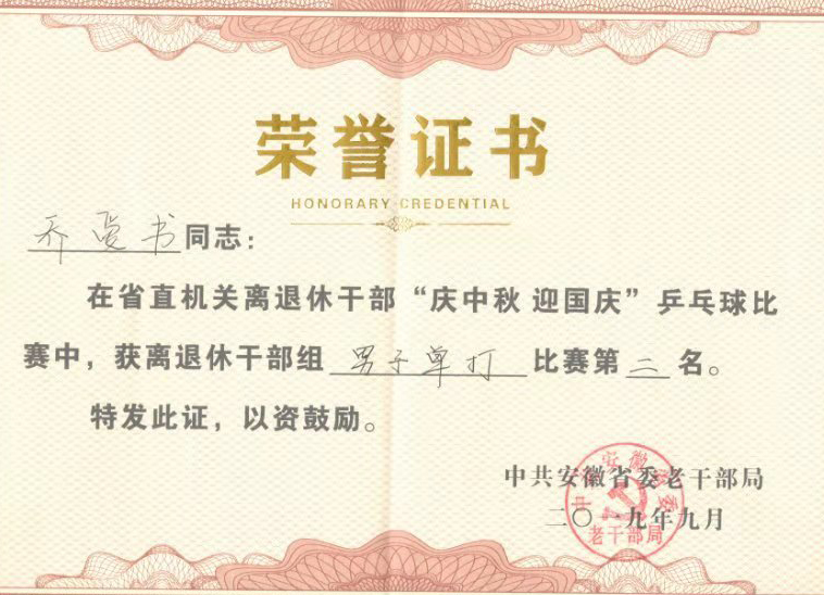 9月16日至20日,在省委老干部局舉辦的省直機關離退休干部“迎中秋 慶國慶”乒乓球比賽中,校(院)老同志喬愛書力克多名強手,獲得男子個人單打第二名好成績。