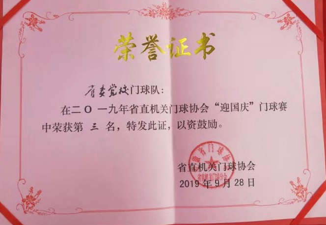在2019年省直機關喜迎“國慶”七十周年門球比賽中,校(院)門球隊團結協作,頑強拼博,充分發揮技戰術優勢,獲得第三名的優異成績。