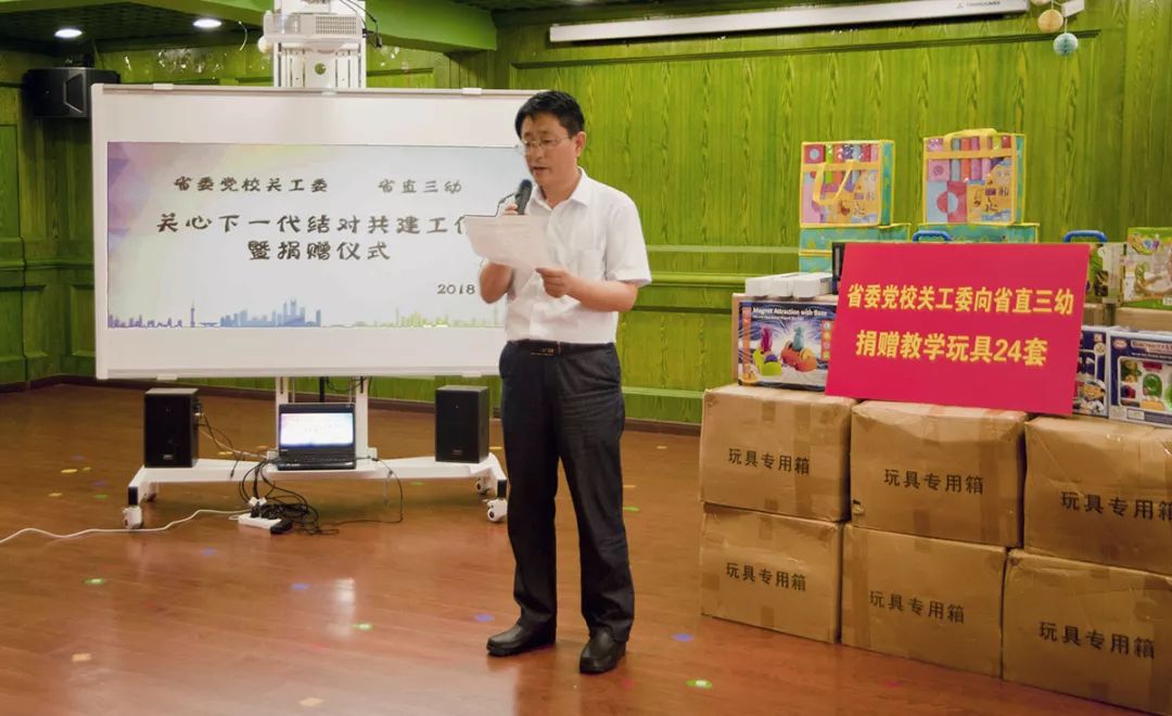 7月4日,省委黨校關工委與省直機關第三幼兒園舉行關心下一代結對共建工作暨捐贈儀式,簽訂結對共建協議。省委黨校副廳級組織員丁毅,關工委主任趙湘冰,辦公室副主任劉軍,省直三幼園長聶佳,以及省委黨校離退休工作處及園方相關人員參加活動。