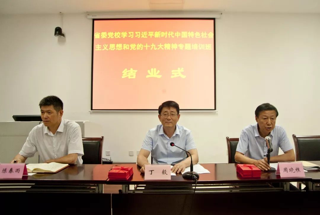 6月29日,省委黨校舉行黨員干部學習習近平新時代中國特色社會主義思想和黨的十九大精神第2期輪訓班結業式。副廳級組織員丁毅出席并講話,組織人事處處長周曉樵主持,機關黨委專職副書記陳春雨和培訓班全體學員參加結業式。