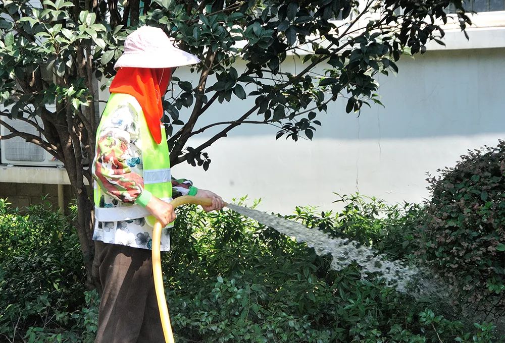 秀美校園,因為有你。綠化部、物業部的綠化養護工、保潔人員正在給花草樹木澆水、清掃路面。