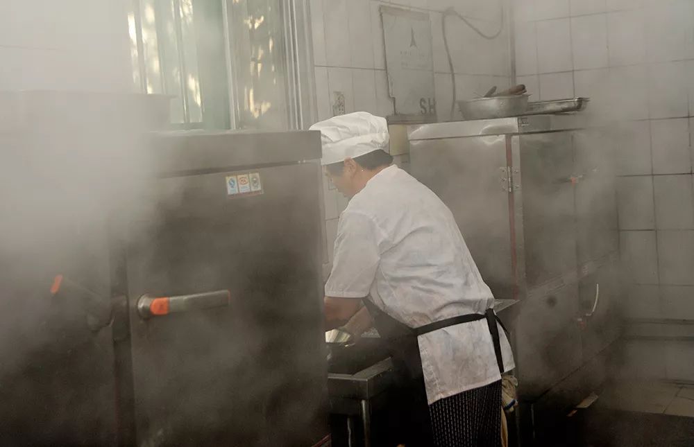 校機關食堂后堂,飲食服務部的廚師們在高溫下為學員、教職工供應好每日三餐。
