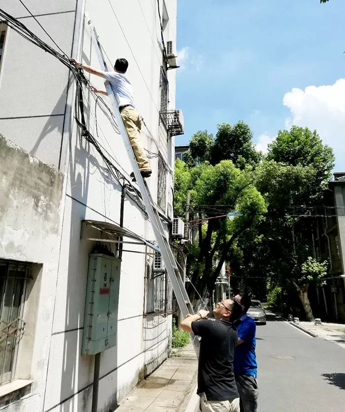 信息中心的技術人員攀爬架線,揮汗如雨,將“暢通保衛戰”進行到底。