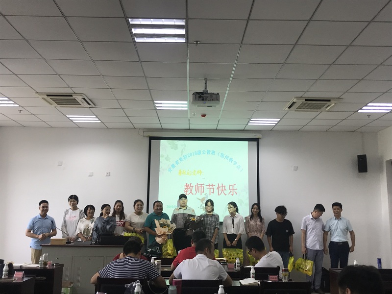 活動在童聲版的《童年》歌聲中開始,讓全體師生回憶起童年的點點滴滴。2018級公管專業黨支部書記孟祥海代表全體學員作主旨發言,感謝老師辛勤付出、勉勵學員發奮圖強。學員代表梅春梅作為一名在職教師,代表全班學員向老師致以節日的敬意。班主任老師張見偉、任課老師張學春接收了節日鮮花和祝福并和同學們交流了內心的感受?;顒蝇F場,2018級班委為黨校教師代表、部分具有教師身份的學員代表送上了節日的慰問,全體代表合影留念。
