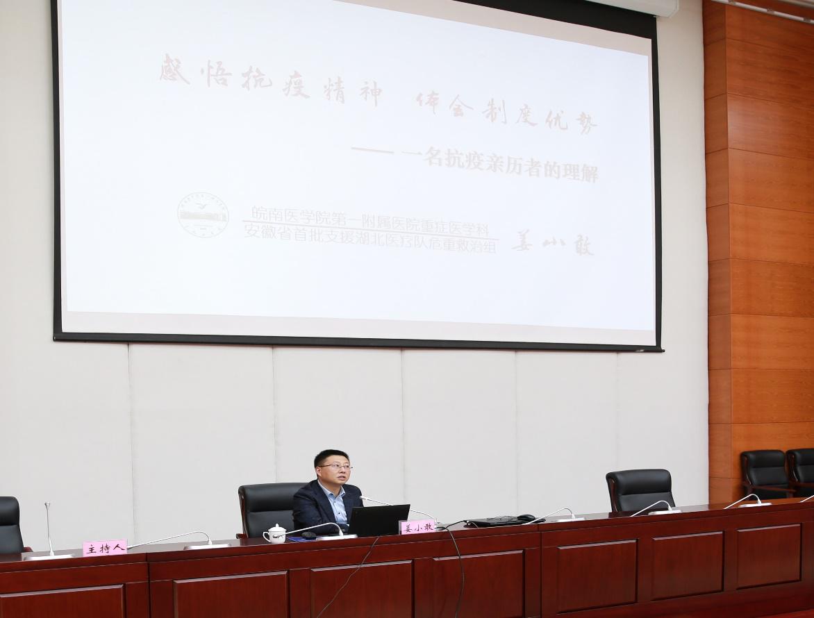 為培養(yǎng)在職研究生學(xué)員講黨性、樂奉獻(xiàn)、敢擔(dān)當(dāng),充分發(fā)揮黨校錘煉黨性、提升素質(zhì)的“熔爐”作用,根據(jù)蕪湖市委黨校(行政學(xué)院)慶祝建黨100周年總體活動(dòng)安排,4月10日蕪湖教學(xué)點(diǎn)研究生辦公室組織開展了全國(guó)優(yōu)秀共產(chǎn)黨員、全國(guó)抗擊新冠疫情先進(jìn)個(gè)人、安徽省第一批支援湖北醫(yī)療隊(duì)總負(fù)責(zé)人姜小敢同志先進(jìn)事跡報(bào)告會(huì),蕪湖教學(xué)點(diǎn)2019級(jí)、2020級(jí)150余名在職研究生學(xué)員參加。